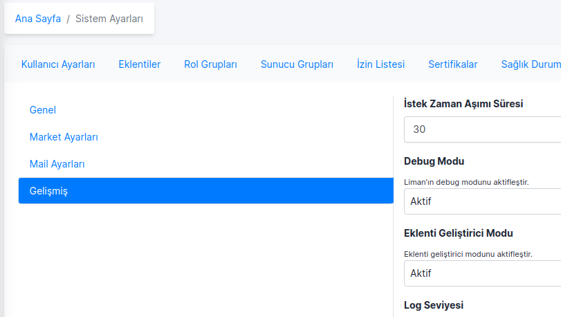 Eklentilerin yedeklenmesi iki şekilde olabilmektedir. Web arayüzü üzerinden eklentinin indirilmesi sağlanabilmektedir. Bunun için Liman Web Arayüzünden "Sistem Ayarları" altındaki "İnce Ayarlar" tabı içerisindeki "Gelişmiş" kısmından "Eklenti Geliştirici Modu" kısmını aktif hale getirmek gerekmektedir.