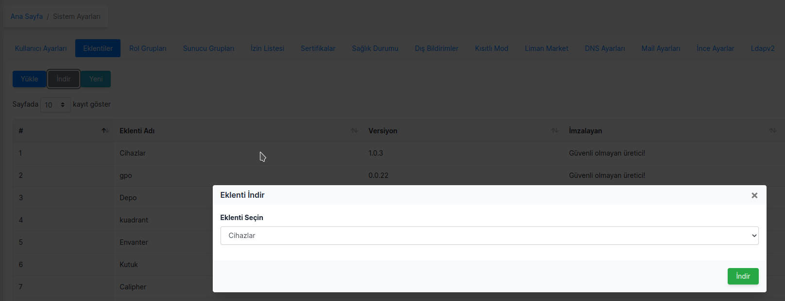 "Eklenti Geliştirici Modu" açıldıktan sonra Sistem Ayarları içerisindeki "Eklentiler" tab'ında eklentiler indirilebilir duruma gelecektir. Bu şekilde "**İndir**" butonuna basıp eklentiler tek tek indirilebilmektedir.